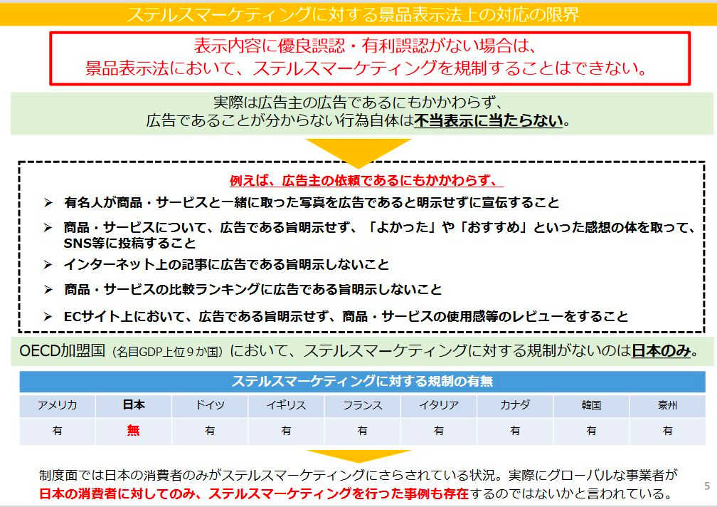 この資料で明らかにされたのが、先進国でステマ規制がないのは日本だけという事実には、改めて驚かされました。