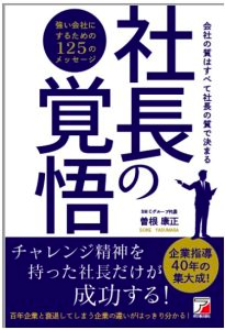 また原稿のタイトルは『経営者の覚悟』でした。エフや明日香出版社の営業部のみなさんが書店の担当さんとも相談され、『社長の覚悟』のほうがグッときますよと提案してくれました。おかげで書店さんの受けもよく、多くのお店で売れて増刷も3回を重ねました。