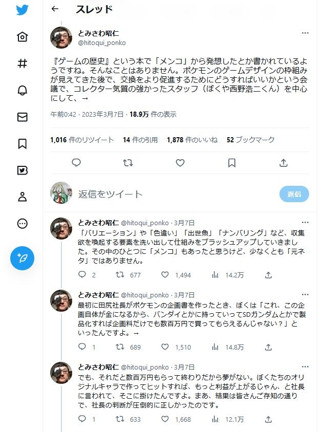 しかし、岩崎・稲田史観から語った同書の見解には、異を唱える声が多い。「ポケットモンスター」シリーズの制作にかかわったシナリオライター・とみさわ昭仁(@hitoqui_ponko)さんはTwitterで「(ポケモンは)「メンコ」から発想したとか書かれているようですね。そんなことはありません」と投稿・・・。