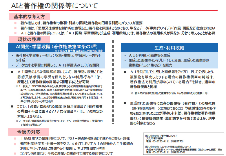 先日、文化庁、内閣府から「AIと著作権の関係等について」という文書で、AIについて日本政府の見解が示されました。とても興味深い文書ですので、目にした方も多いことでしょう。