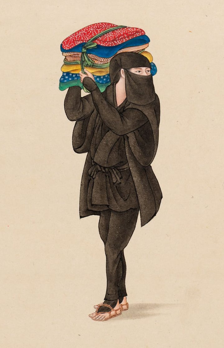 紐でひとまとめに括った衣類を肩に絡げ、顔を布で隠し、辺りを伺う男。しかも全身が黒装束とは、これいかに。