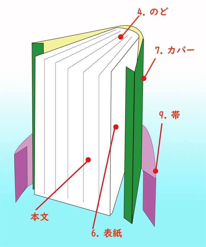 6.「表紙」=本文を保護するため厚紙でつけた外装。反対側は「裏表紙」、背側は「背表紙」。