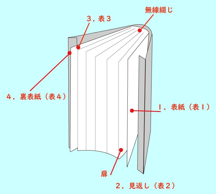 「表2」は表紙(表1)の裏側の面になります。この呼び方に従って本の裏面、表紙の反対側にあたる「裏表紙」は「表4」。表4の裏側は「表3」となります。本文よりも厚手の紙になっている表紙の4つの面だけを、1から4まで番号付けをしているわけです。