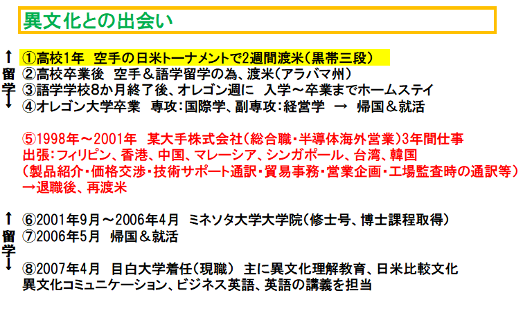 2006年に帰国し、2007年4月に目白大学着任。異文化理解教育、異文化コミュニケーション、ビジネス英語、キャリア教育、英語の講義などを担当し、現在の研究テーマは海外留学の教育的価値で国際学会等で研究成果を発表しているとのことです。また高校生や企業向けに異文化コミュニケーションの模擬授業や研修も行っておられます。