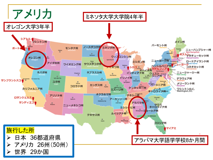 日々、語学学校で英語を学び、そして空手を練習し大会に出る日々。このような留学生活を約10か月続け、その間、組手ではライト級でチャンピョンになり、そしてヘビー級との対戦も制し、グランドチャンピオンにもなりました。その後、そのまま空手を続けるか、それとも違う土地に行き、行きたい大学に行くか、かなり悩んだそうですが、結果、空手からは一旦離れ、オレゴン州ユージンに引っ越しという選択をされたそう。そしてオレゴン大学で国際学と経営学を専攻し、学士号を取得。オレゴンでは入学から卒業まで同じホームステイ先で子育ての様子、学校や地域とのかかわり方、夫婦のありかた等多くの異文化を肌で感じ、日々の生活の中で学んでいったそうです。本当の家族のように過ごした大学時代、現在もこのアメリカ人のご一家とは大切な繋がりがおありです。