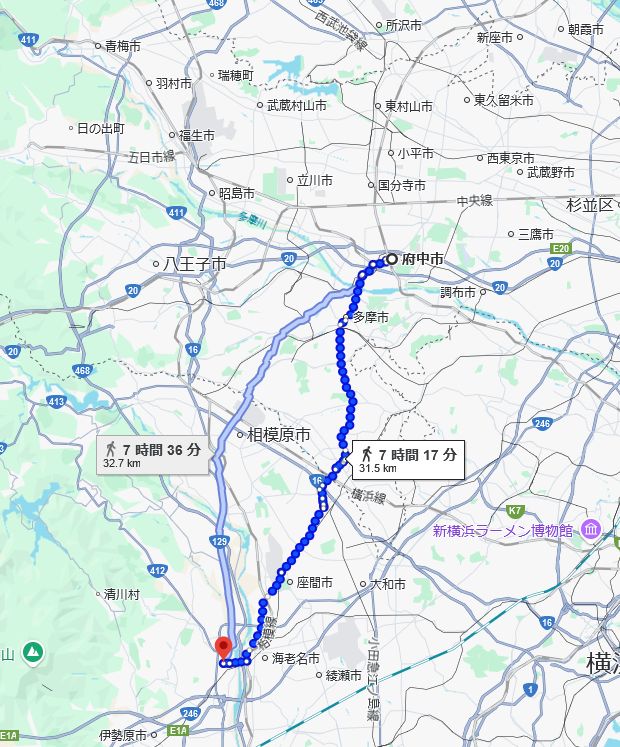 府中~厚木間の距離は、31.5キロ。厚木~小田原間は38キロ。