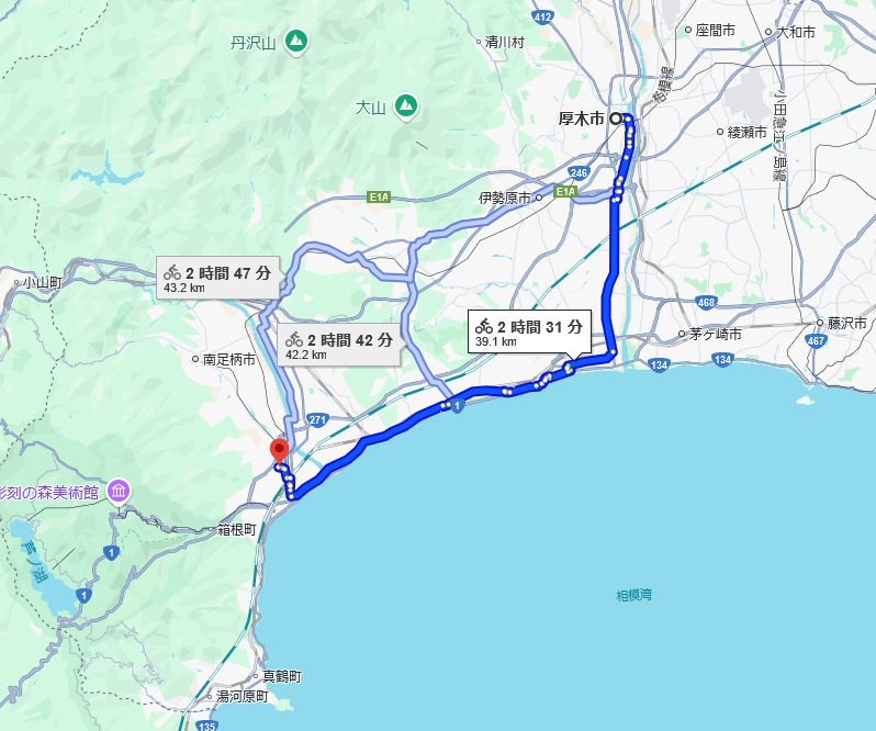 厚木~小田原間の行程(自転車でのルートが当時の行程に該当)