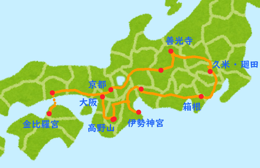 旅記録によると、全旅程を通して十~十五人の集団で、東京-名古屋-伊勢-奈良-香川-大阪-京都-長野をぐるりと一周する旅を行っていました。